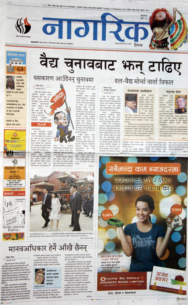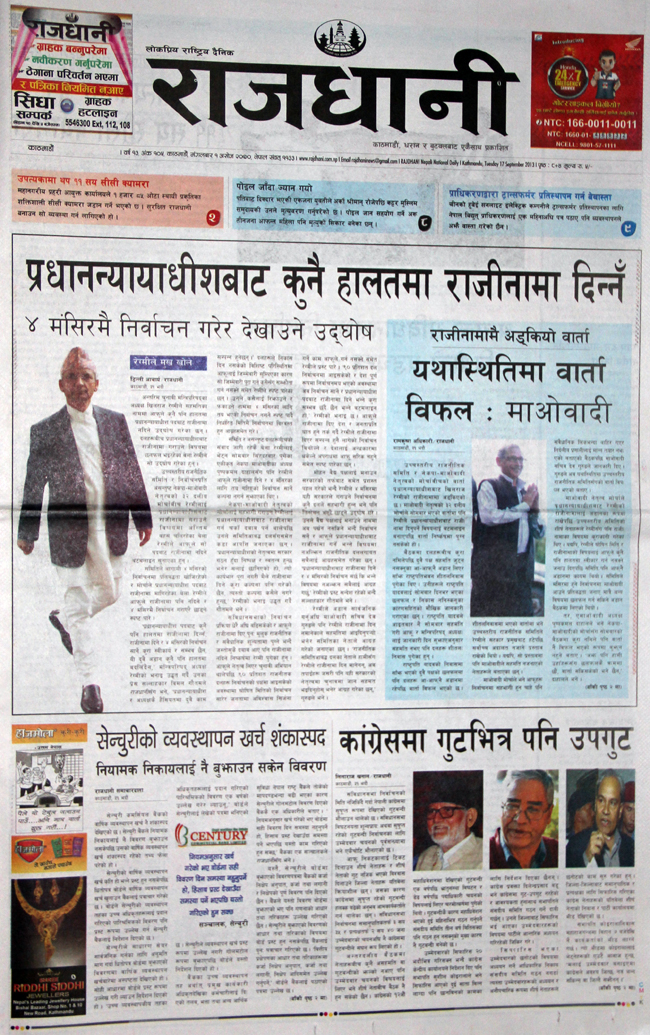 प्रधानन्यायाधीशबाट राजीनामा नदिई मंसिर ४ मै चुनाव गराउने रेग्मीले उद्घोष गरेको खबर राजधानी दैनिकले मुख्य रुपमा छापेको छ भने, बैद्य चुनावबाट टाढिनुको कारण नागरिक दैनिकले मुख्य रुपमा छापेको छ ।
