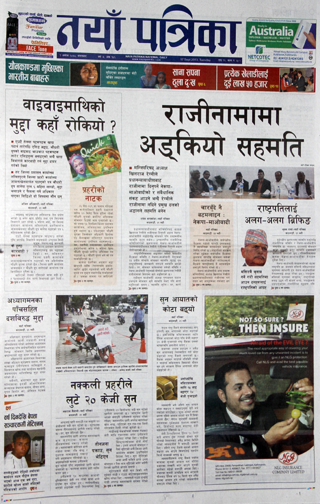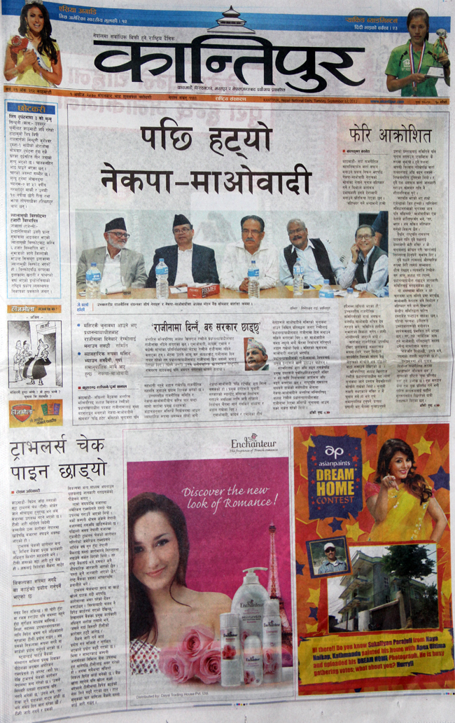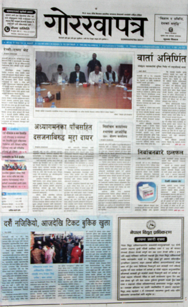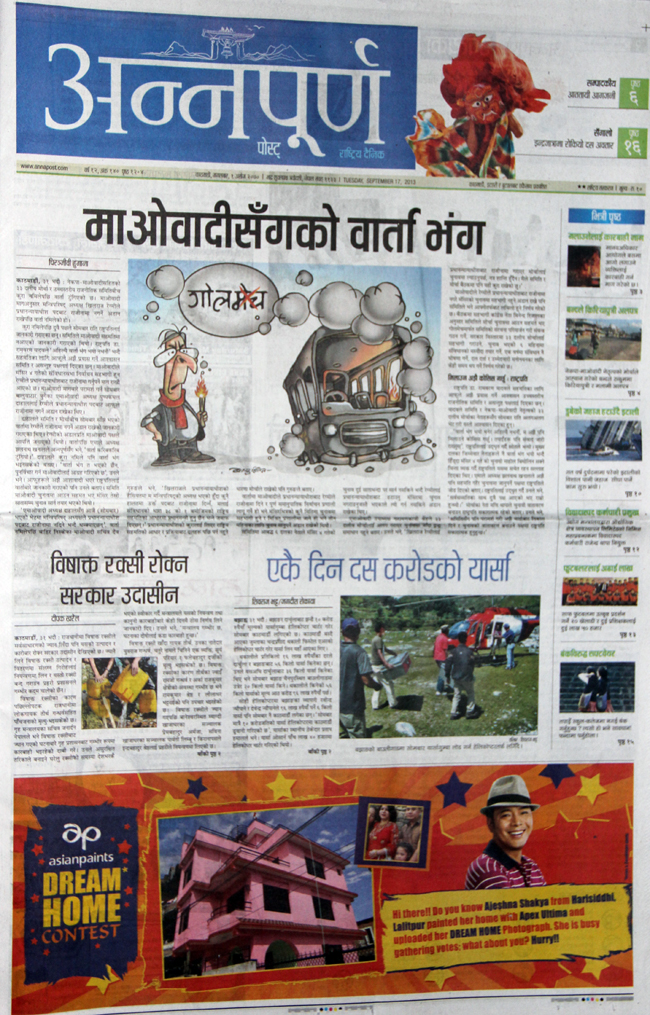 आज मिति २०७० असोज १ गते मंगलबार । राजधानीबाट प्रकाशित आजका दैनिक पत्रिकाले उच्चस्तरीय राजनीतिक समिति र निर्वाचनको विपक्षमा रहेको नेकपा-माओवादीसहितको मोर्चासँग भएको वार्ता विफल भएको खबरलाई प्राथमिकताका साथ छापेका छन् ।