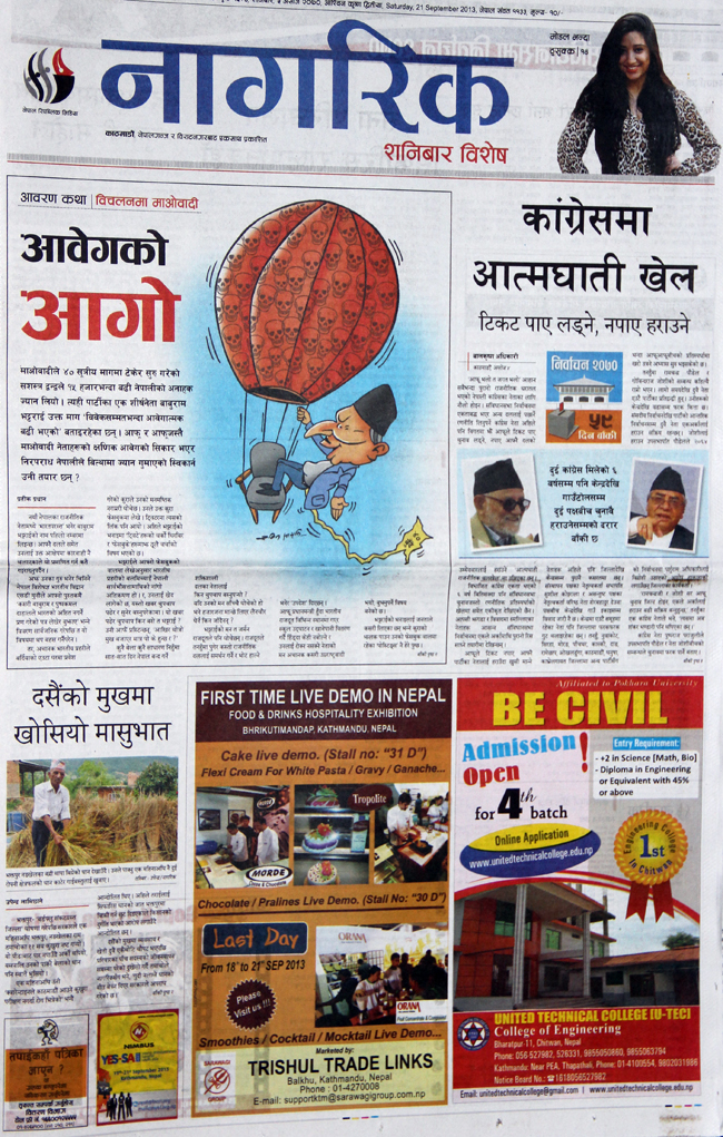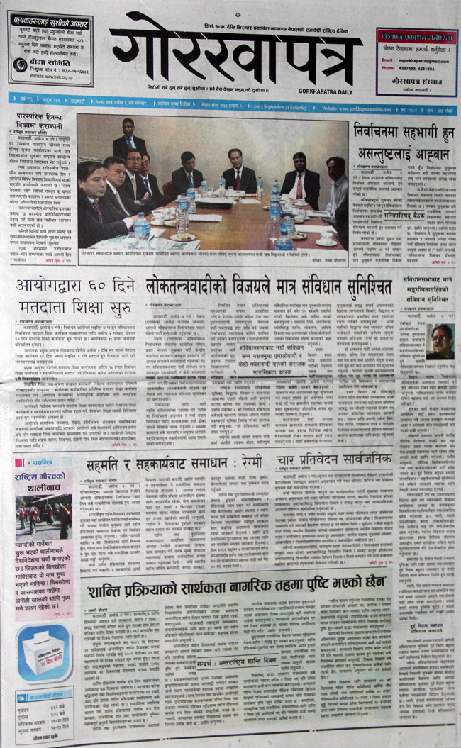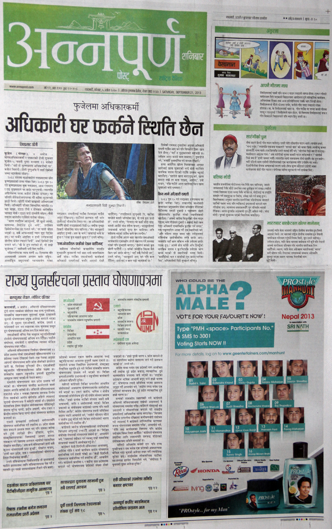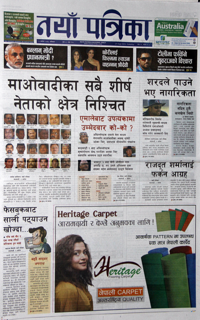 नयाँ पत्रिकाले माओवादीका सबै शीर्ष नेताको निर्वाचन क्षेत्र निर्धारण भएको खबरलाई मुख्य रुपमा छापेको छ । राज्य पुनःसंरचनाको मुद्धा दलहरुको चुनावी घोषणा पत्रमा रहेको अन्नपूर्ण पोस्टमा खबर छ ।