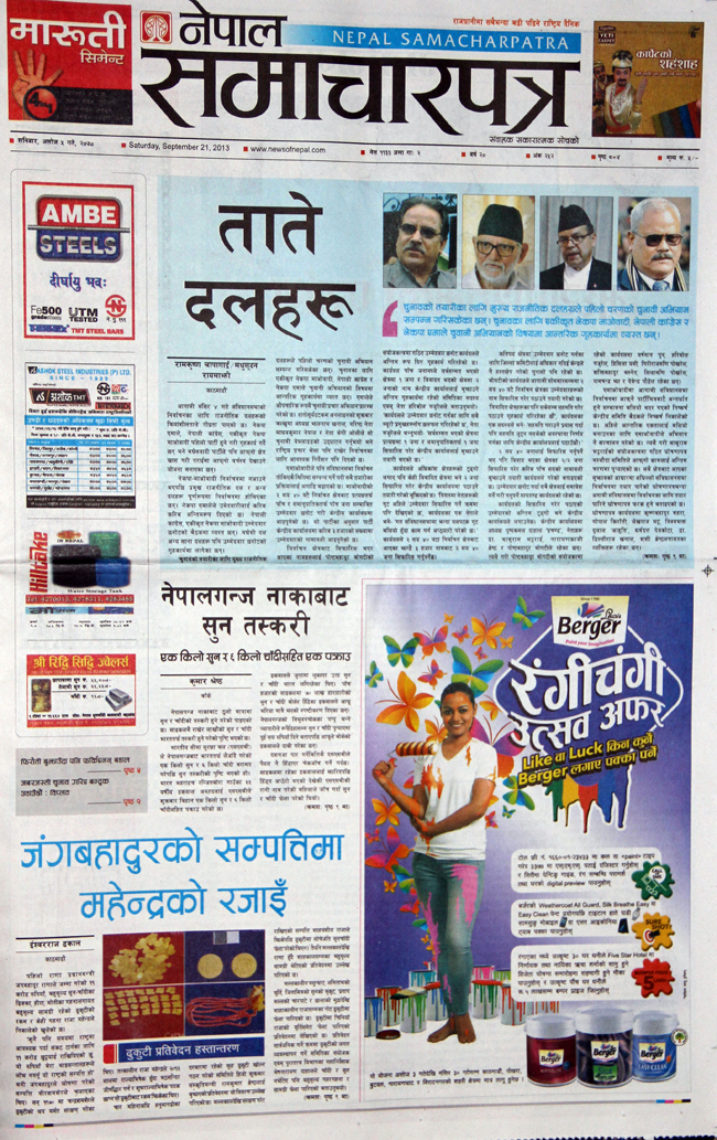 आज मिति २०७० असोज ५ गते शनिबार । राजधानीबाट प्रकाशित आजका दैनिक पत्रिकाले दलहरु निर्वाचनको लागि तातेको खबरलाई प्राथमिकताका साथ छापेका छन् ।