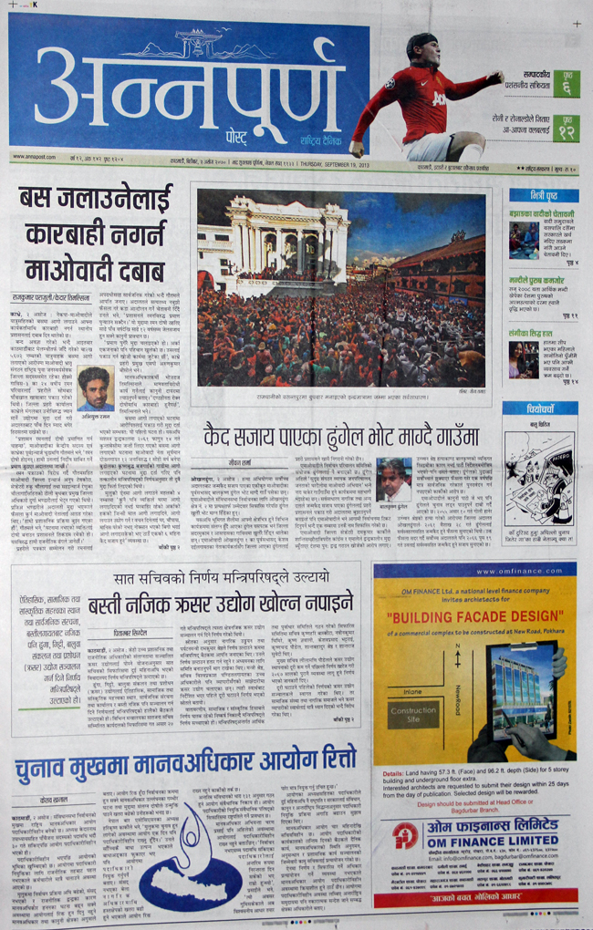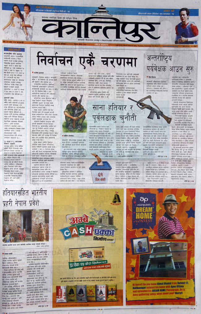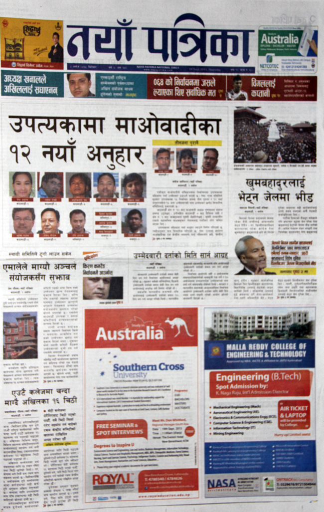 उपत्यकामा माओवादीका १२ नयाँ अनुहार आएको नयाँ पत्रिकामा मुख्य खबर छ भने,निर्वाचन एकै चरणमा गर्ने तयारी भइरहेको खबर कान्तिपुर दैनिकले मुख्य रुपमा छापेको छ ।