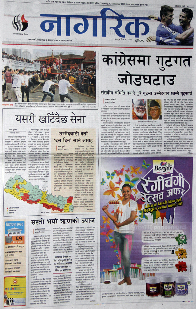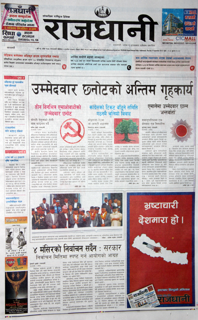 आज मिति २०७० असोज ३ गते बिहीबार । राजधानीबाट प्रकाशित आजका दैनिक पत्रिकाले दलहरु उम्मेदवार छनोटको अन्तिम गृहकार्यमा रहेको र कांग्रेसको टिकट बाँड्ने समिति गठनमै विवाद चुलिएको खबरलाई प्राथमिकताकासाथ छापेका छन् ।