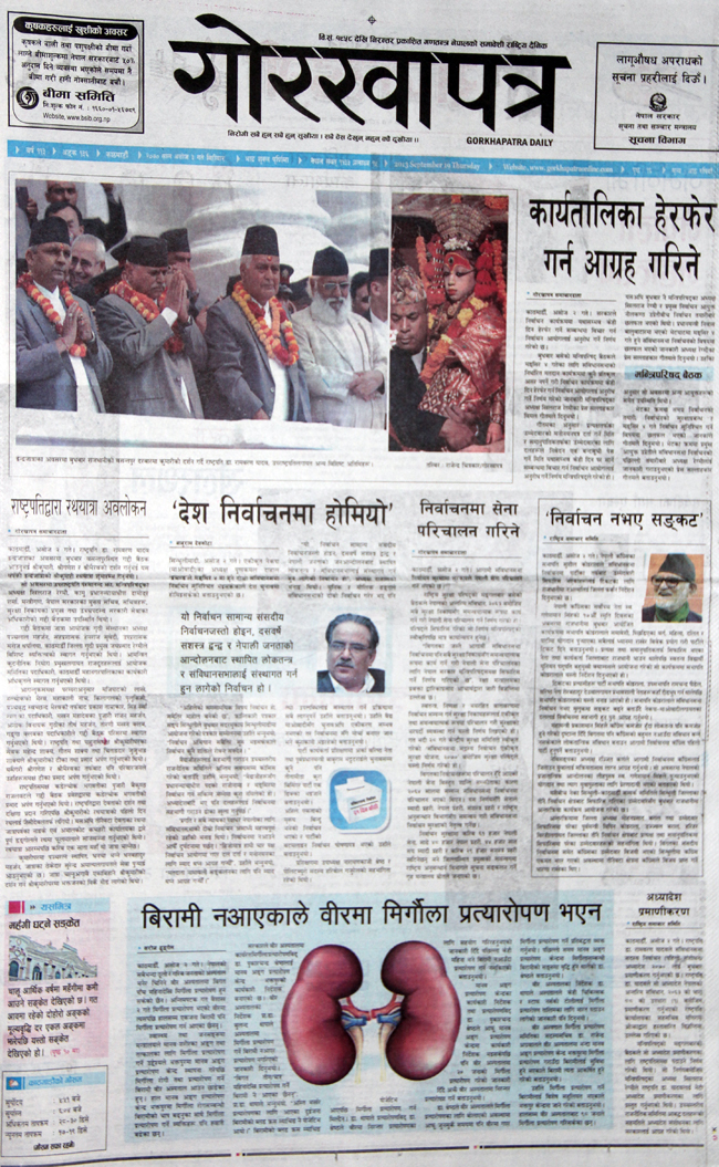 सरकारले निवार्चनको लागि मंसिर ४ लाई तय गरेको निर्वाचन नसर्ने अडान राखेको खबर राजधानी दैनिकले मुख्य रुपमा छापेको छ, भने अन्नपूर्ण पोस्टले कैद सजाय पाएका ढुंगेल भोट माग्दै गाउँमा पुगेको खबरलाई मुख्य बनाएको छ ।
